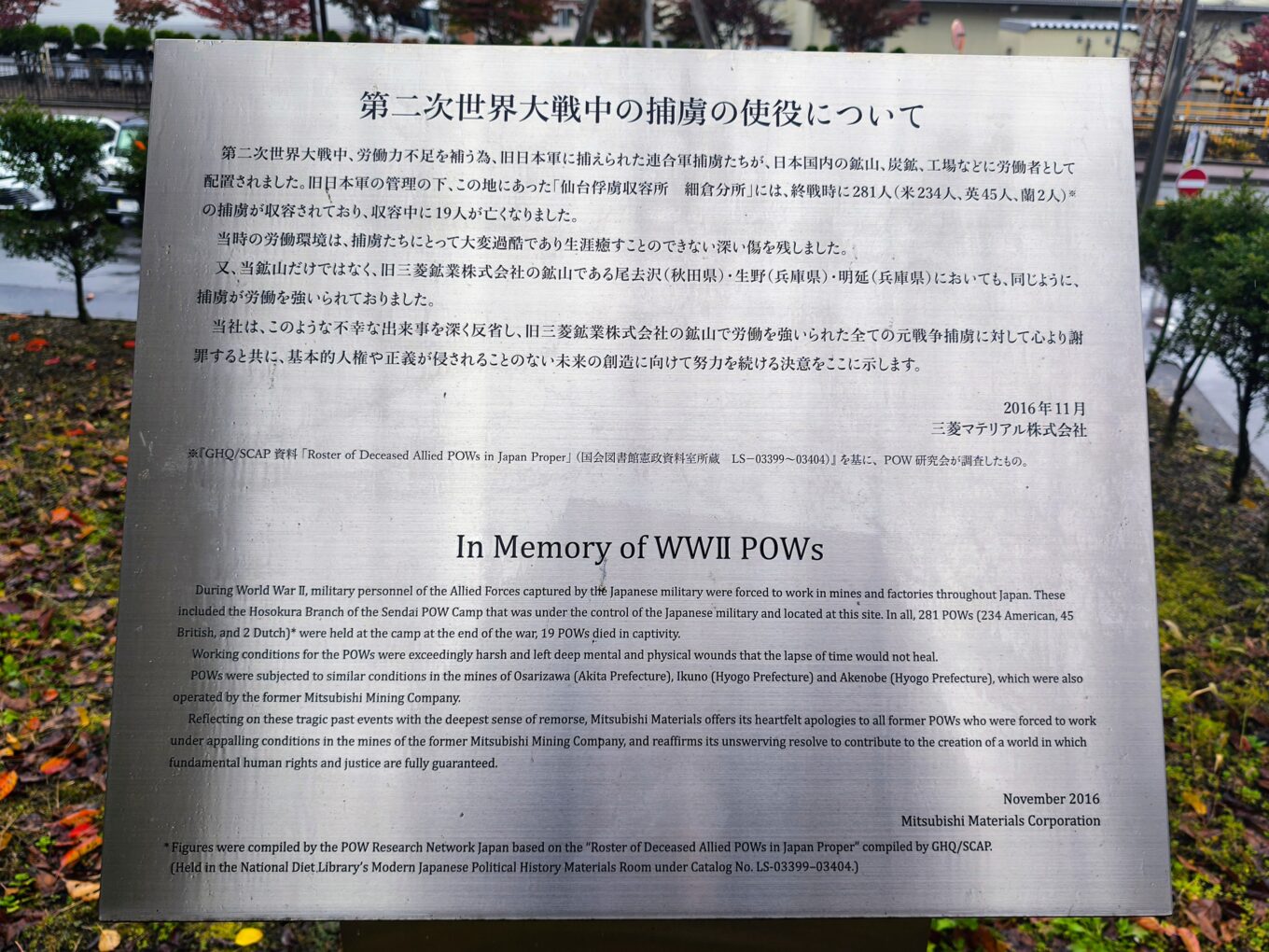 製錬所を見渡せる場所に第二次世界大戦時の捕虜についての説明板がありました。終戦時に281人(米234人、英45人、オランダ2人)の捕虜が収容されており、収容中に19人が亡くなったとあります。