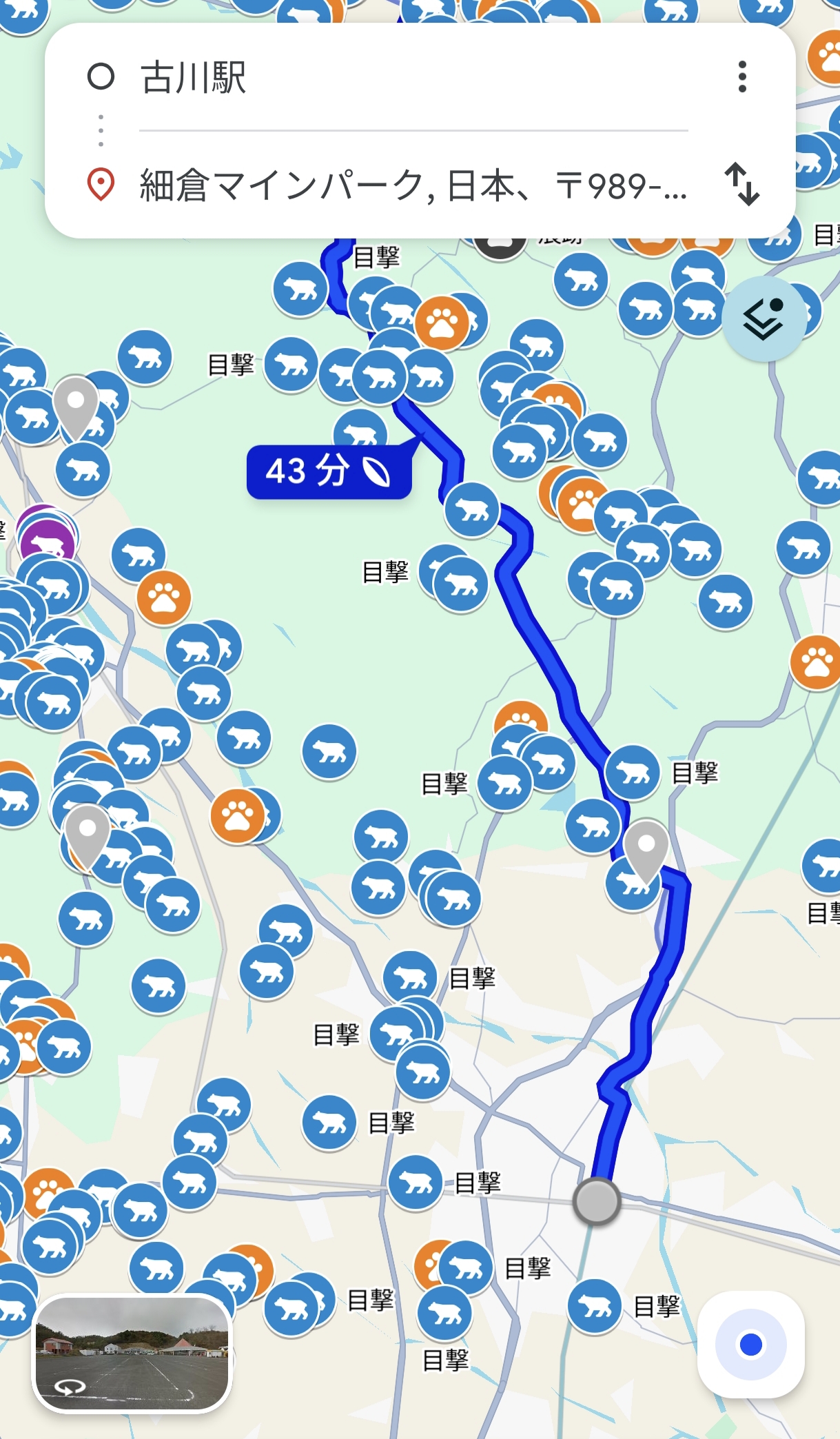 途中でクマの出没マップを見ると、点が増えていきます。いよいよクマの生活圏に入ってきたことを実感しました。